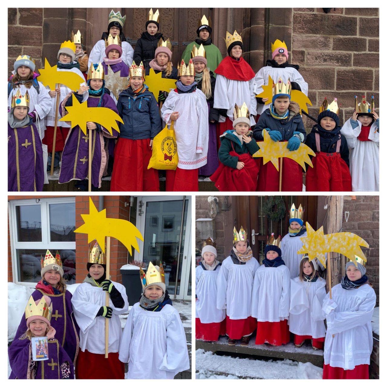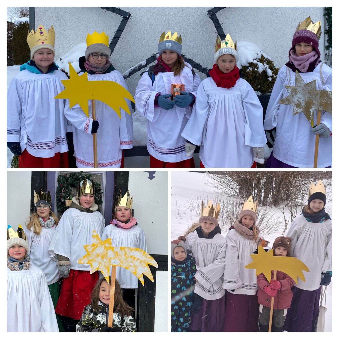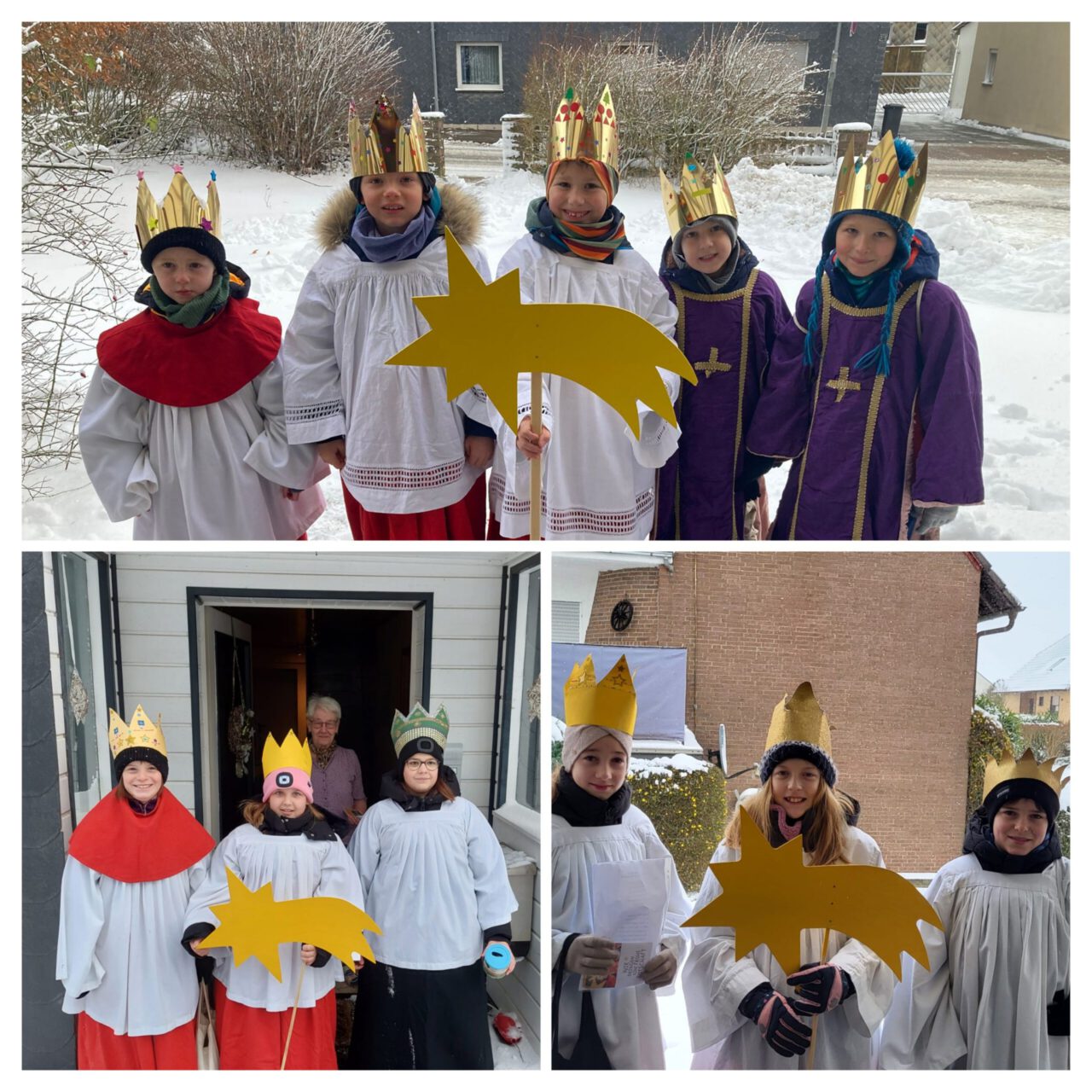 Die Sternsinger der evangelischen und katholischen Kirche in und um Stadtoldendorf mussten dieses Jahr einige Hindernisse überwinden. Wie gewohnt waren die Gruppen an den ersten beiden Januarwochenenden unterwegs. Dieses Jahr mussten sie sich durch Schneeberge kämpfen und Eisglätte widerstehen. Dabei rutschten einige aus, so dass in einer Gruppe alle Könige übereinander purzelten. In Heinade ging auch noch eine Krone verloren. Dank der WhatsApp-Dorfgruppe konnte diese aber schnell dem rechtmäßigen König übergeben werden, so dass die Gruppe ihren Weg fortsetzen konnte. Trotz zahlreicher Hindernisse wurden in diesem Jahr einige Rekorde gebrochen. Es waren 42 Kinder und Jugendliche, so viele wie noch nie, in 13 Dörfern unterwegs und besuchten dabei ungefähr 235 Häuser. Unter den Kindern waren teilweise noch Kindergartenkinder und Erst- und Zweitklässler, die sich dem Wetter gestellt und Spenden gesammelt haben. Es kam die Rekord-Spendensumme von genau 3434,34€ zusammen. Mit diesem Geld kann hoffentlich vielen Kindern in Bangladesch und weltweit, die von Kinderarbeit betroffen sind, geholfen werden. Ein großer Dank geht hiermit an alle Beteiligten: die vielen Kinder und Jugendlichen, die unterwegs waren, und auch an die Erwachsenen, die die Kinder begleitet und gefahren sowie Treffen vorbereitet und organisiert haben. Ohne euch alle wäre diese Aktion nicht möglich!